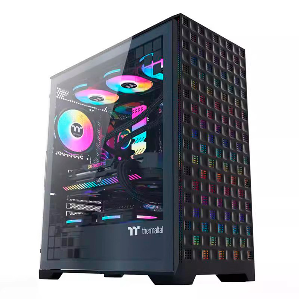 На передней панели расположены порты USB 3.0 и USB 2.0, а также аудио вход и выход, что делает подключение периферийных устройств быстрым и удобным. Прозрачная боковая панель из закаленного стекла позволяет демонстрировать внутренние компоненты и подсветку RGB, придавая корпусу стильный и современный вид.