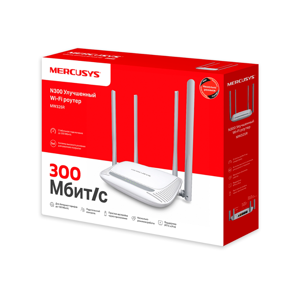 Wi-Fi роутер MERCUSYS MW325R — высокопроизводительный Wi-Fi роутер с поддержкой скорости до 300 Мбит/с, который идеально подходит для использования в доме или офисе. Устройство работает на частоте 2,4 ГГц, поддерживает стандарты IEEE 802.11n/g/b и оснащено 4 мощными антеннами с усилением 5 дБи для увеличения зоны покрытия. MW325R обеспечивает надёжную защиту сети с использованием технологий WPA-PSK и WPA2-PSK, а также роутер поддерживает удобные функции, такие как мост WDS и гостевая сеть. Простота установки и управления делает его оптимальным выбором для пользователей, которые ценят стабильность и удобство.